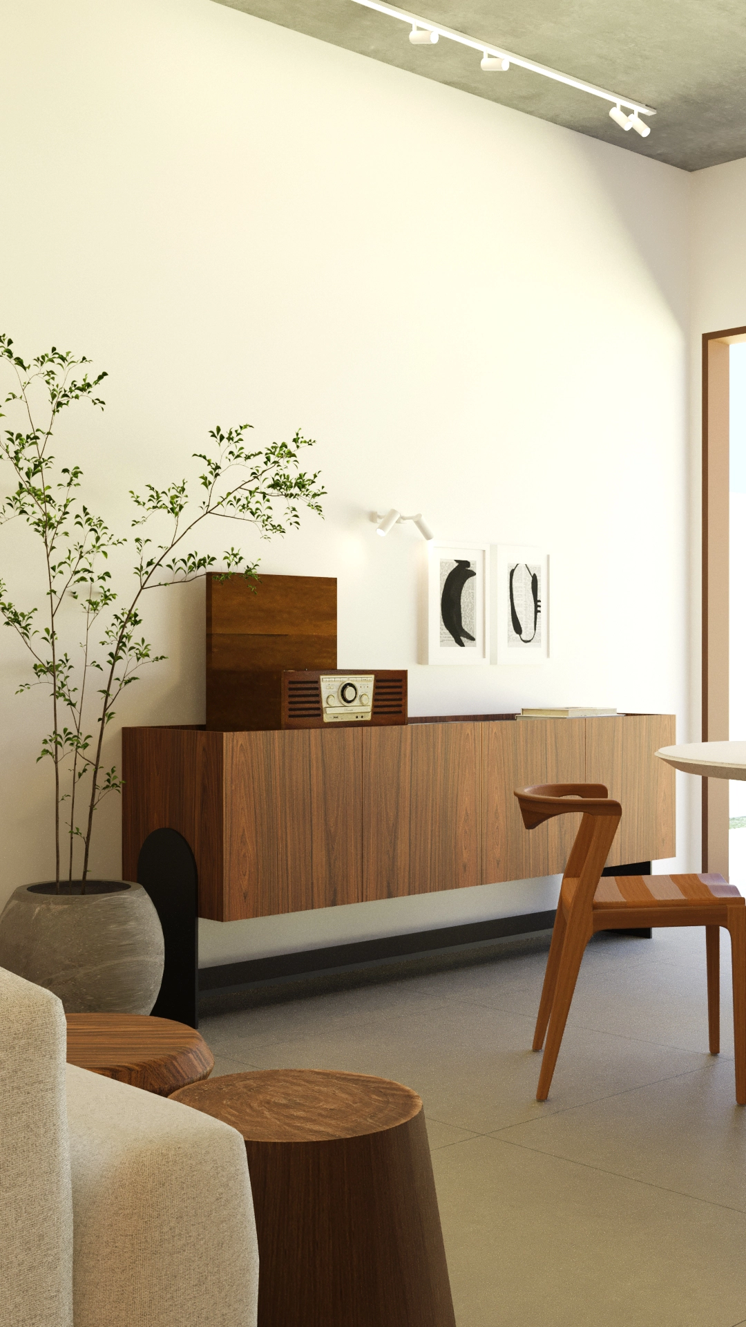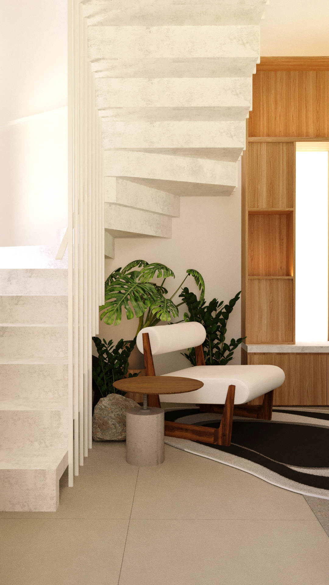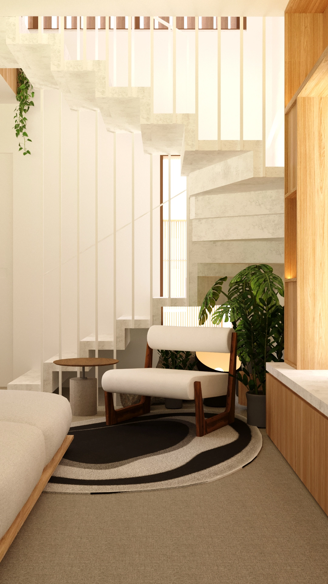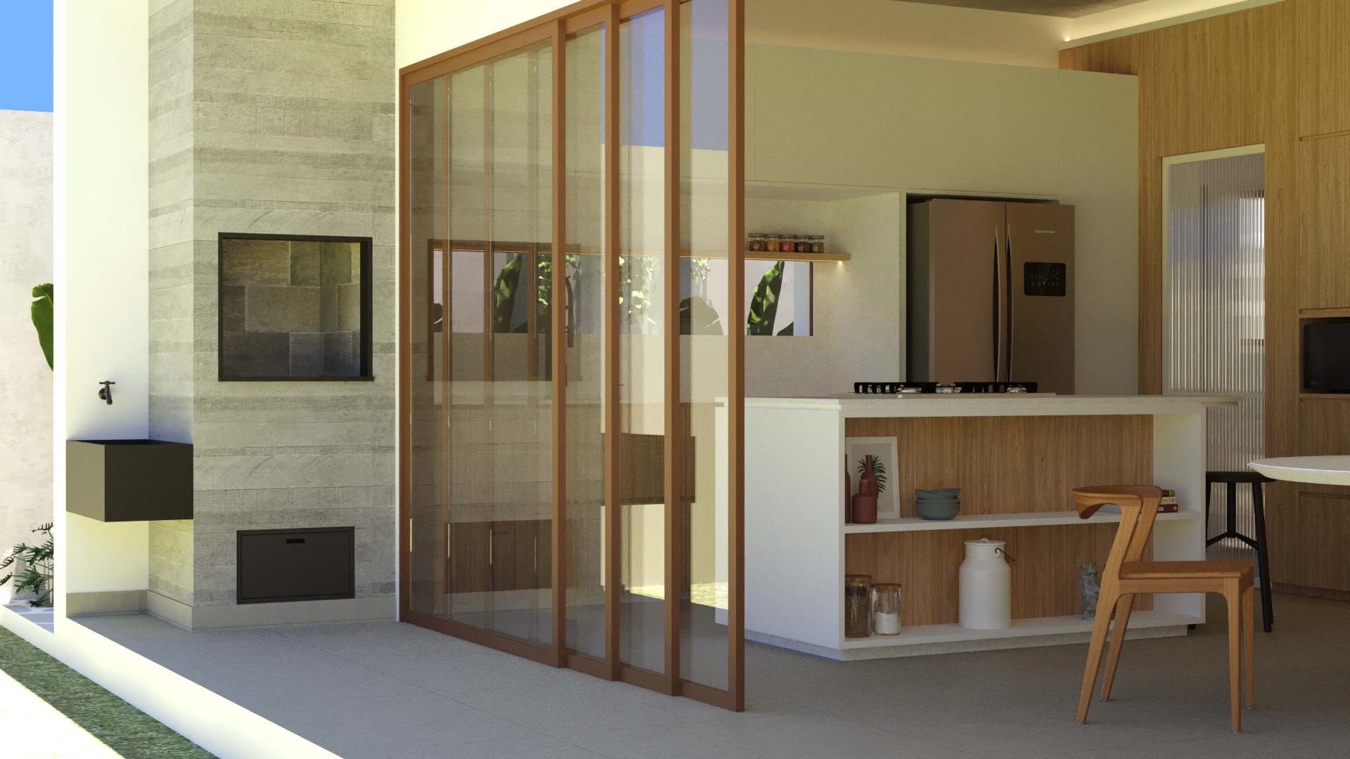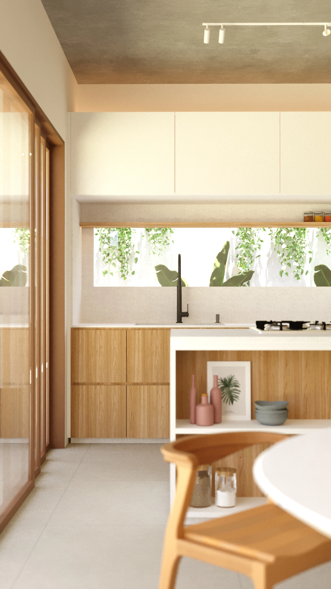 A proposta parte da premissa de criar uma atmosfera acolhedora, com ambientes integrados e fluidos que favoreçam o convívio e o bem-estar cotidiano. O estar, jantar e cozinha compartilham o mesmo plano, conectados visualmente e funcionalmente, favorecendo a convivência familiar e a sensação de amplitude.