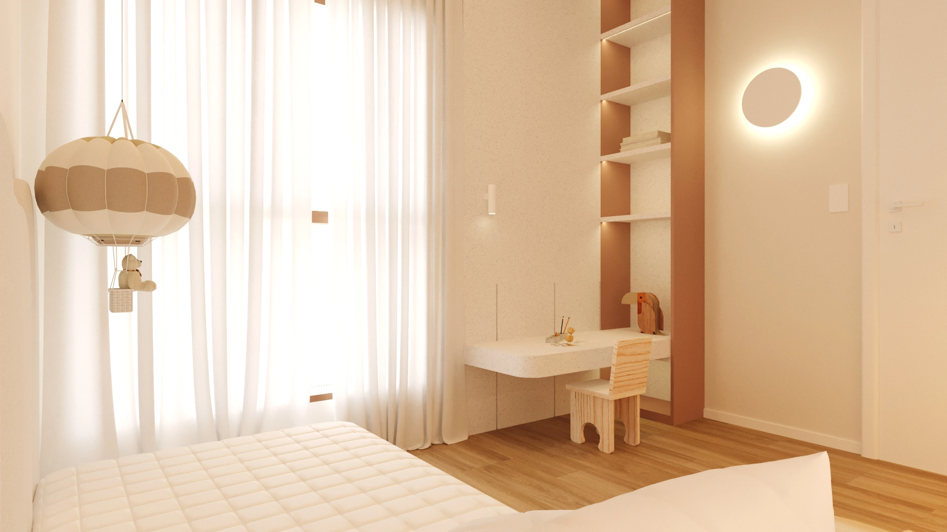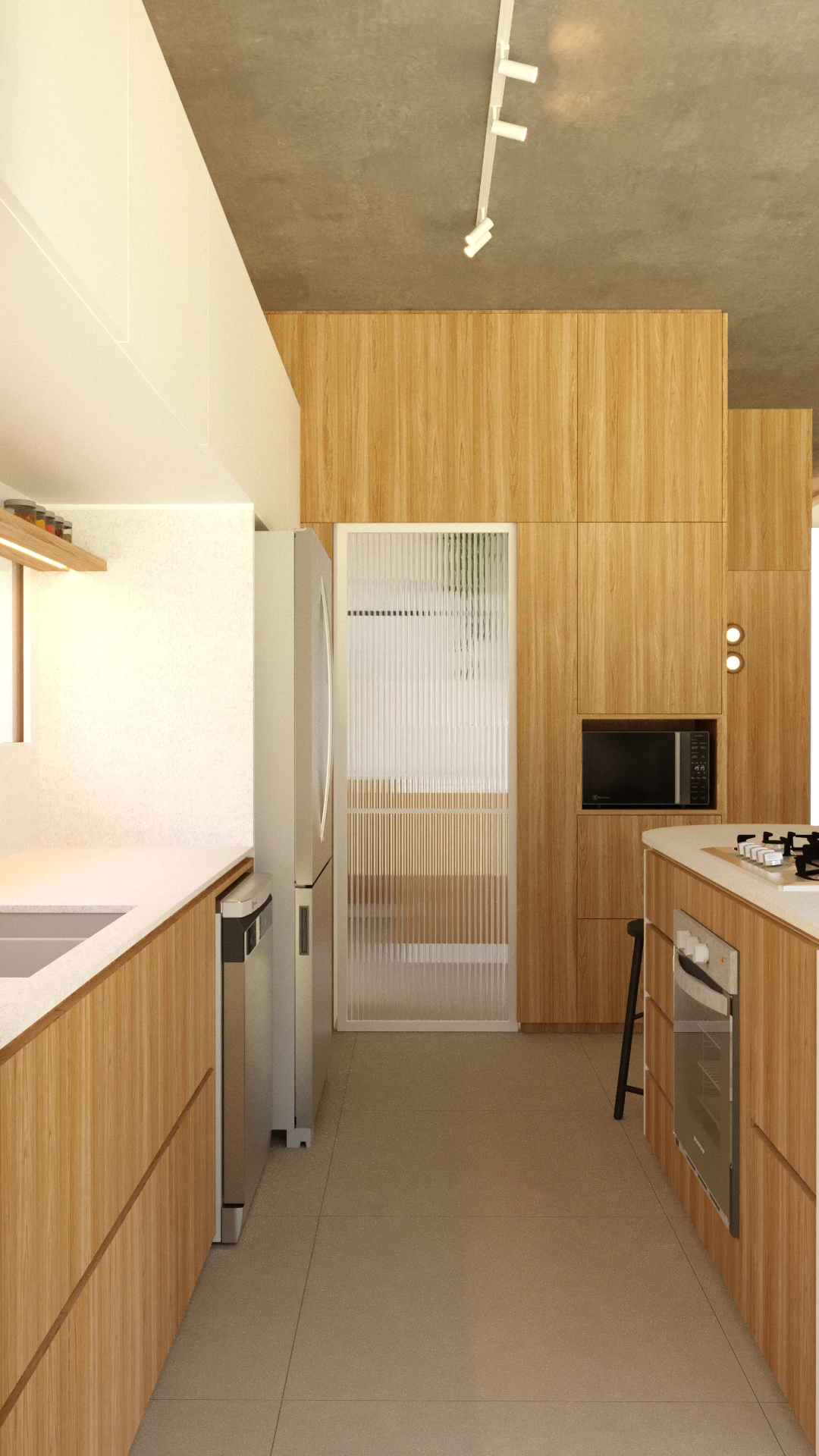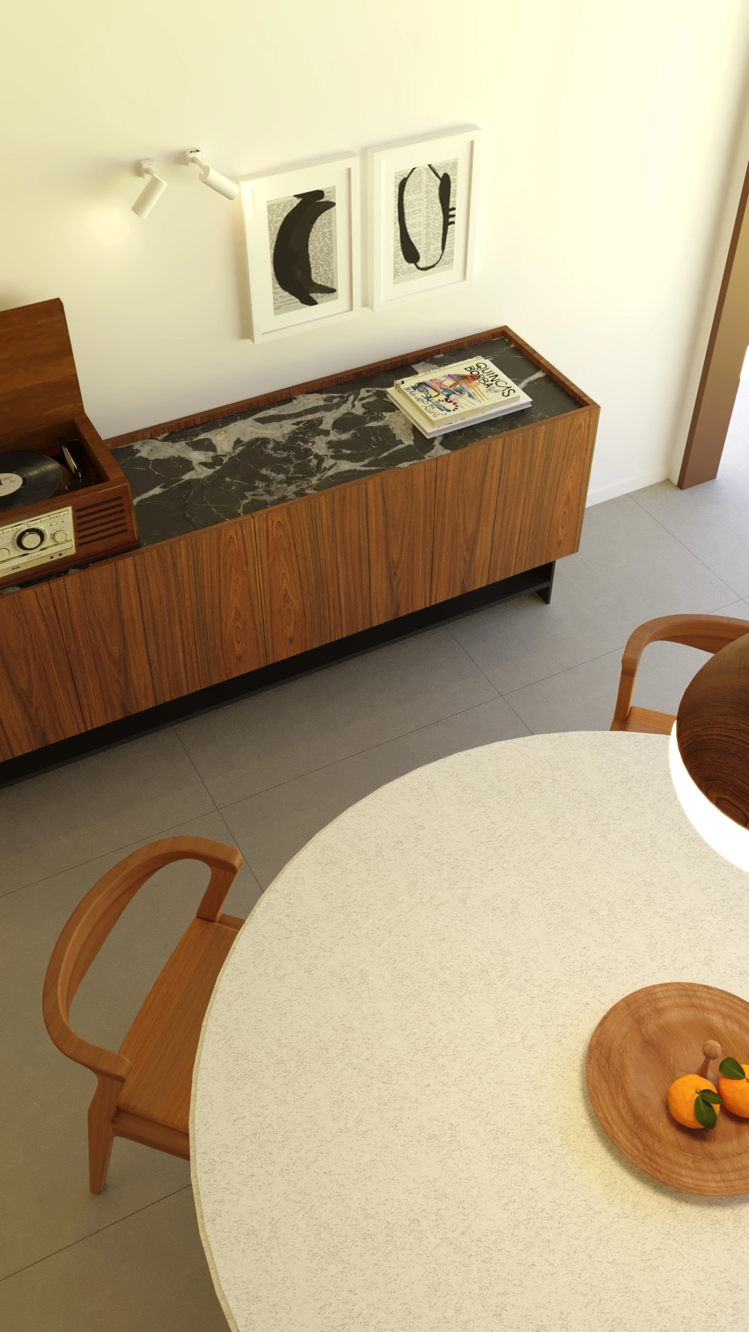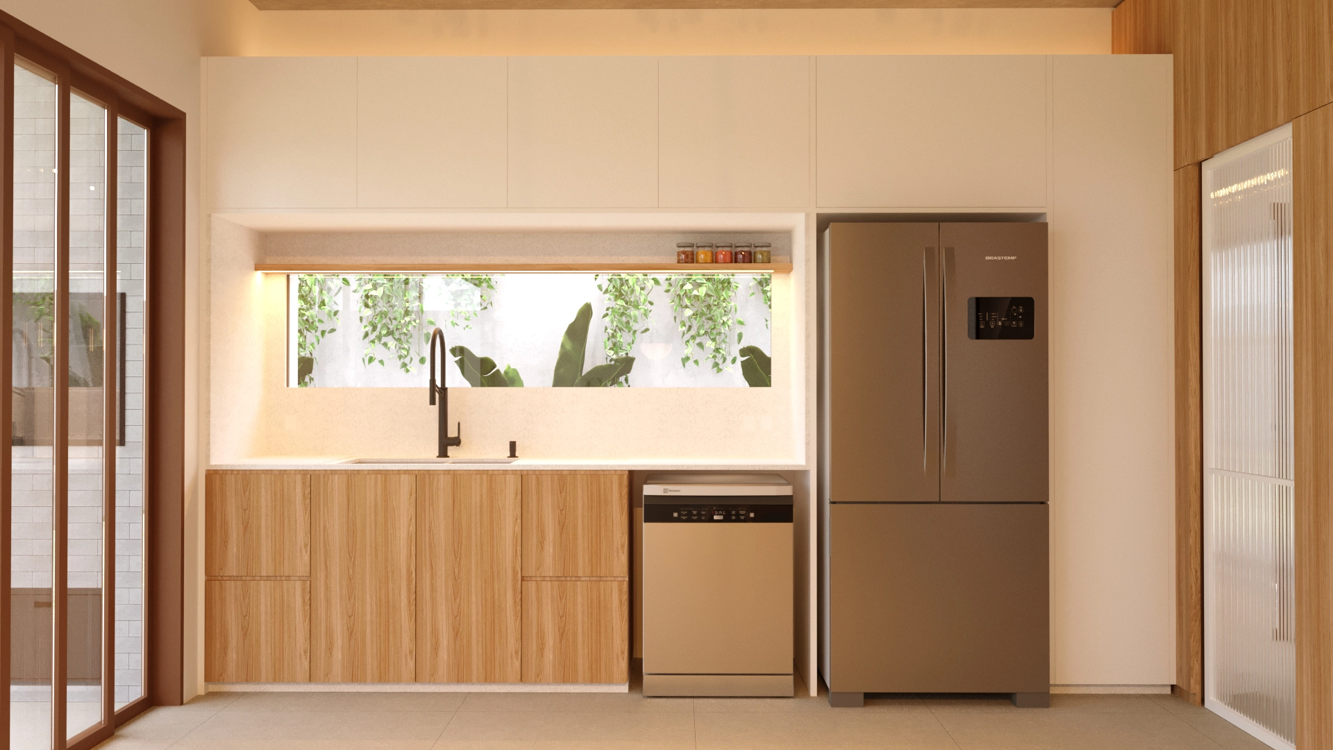 A proposta parte da premissa de criar uma atmosfera acolhedora, com ambientes integrados e fluidos que favoreçam o convívio e o bem-estar cotidiano. O estar, jantar e cozinha compartilham o mesmo plano, conectados visualmente e funcionalmente, favorecendo a convivência familiar e a sensação de amplitude.