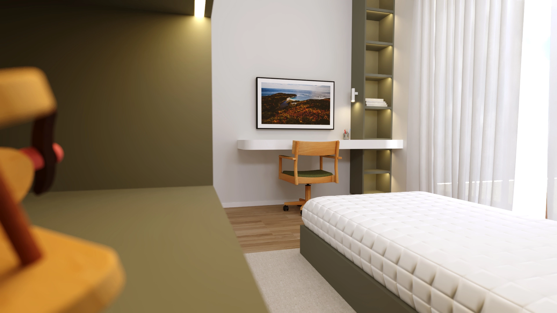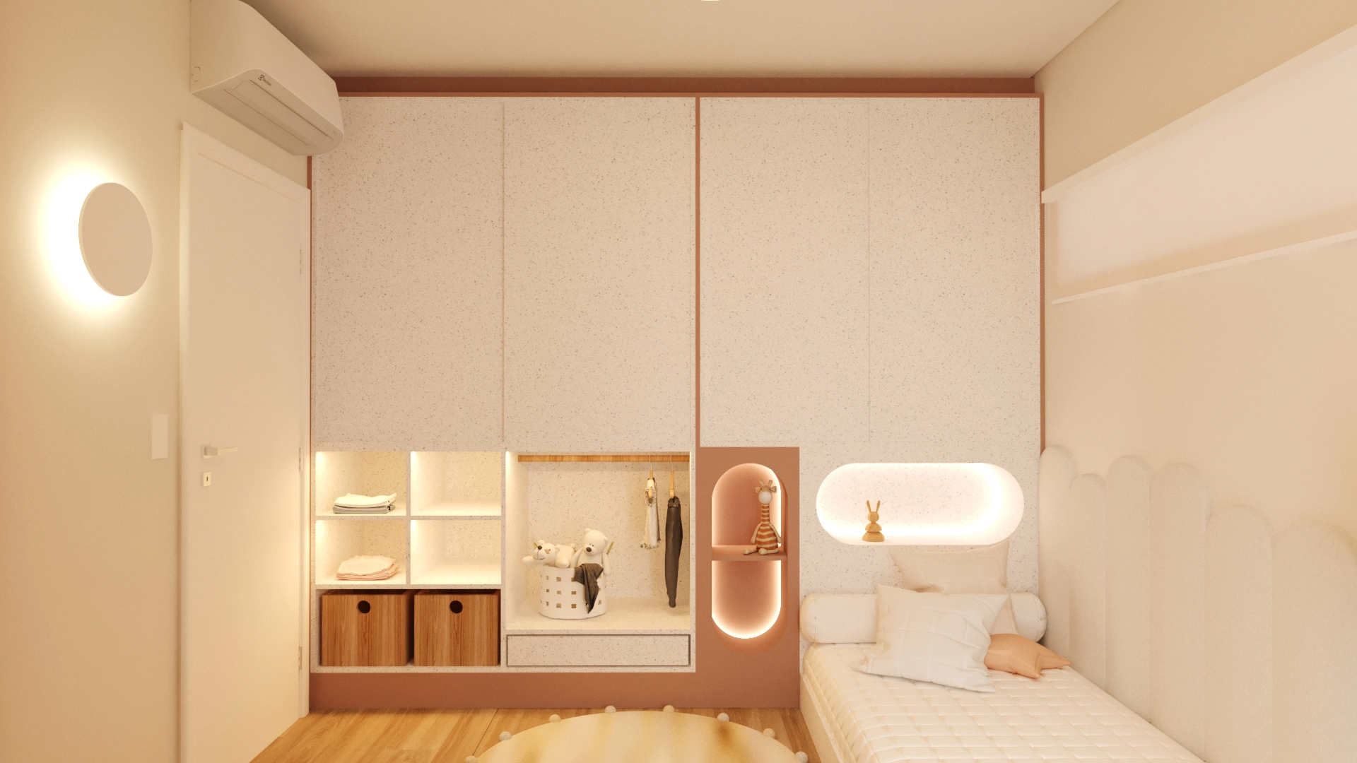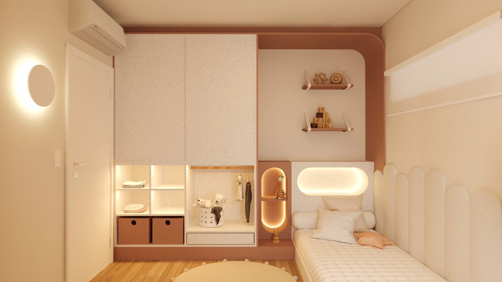 Contrastes visuais, cantos arredondados, texturas e materialidades foram pensados para guiar cada passo com segurança, autonomia e liberdade, uma vez que o principal desafio era projetar esses ambientes para uma pessoa com baixa visão. Apesar de ser um imóvel compacto, criamos um layout amplo e muito confortável.
